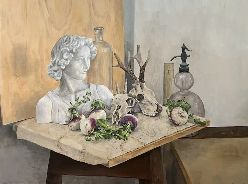 I miei dipinti, disegni e collage sono ispirati alla natura. Traggo ispirazione dai musei di storia naturale, dai giardini botanici e dalla tradizione delle Wunderkammer. Sono particolarmente interessata a come gli umani cercano di catturare e categorizzare la natura e all'interazione tra le strutture ordinate umane e la rigogliosa profusione della natura, come le intricate serre vittoriane piene di piante tropicali lussureggianti o le vetrine di vetro che mostrano farfalle appuntate.